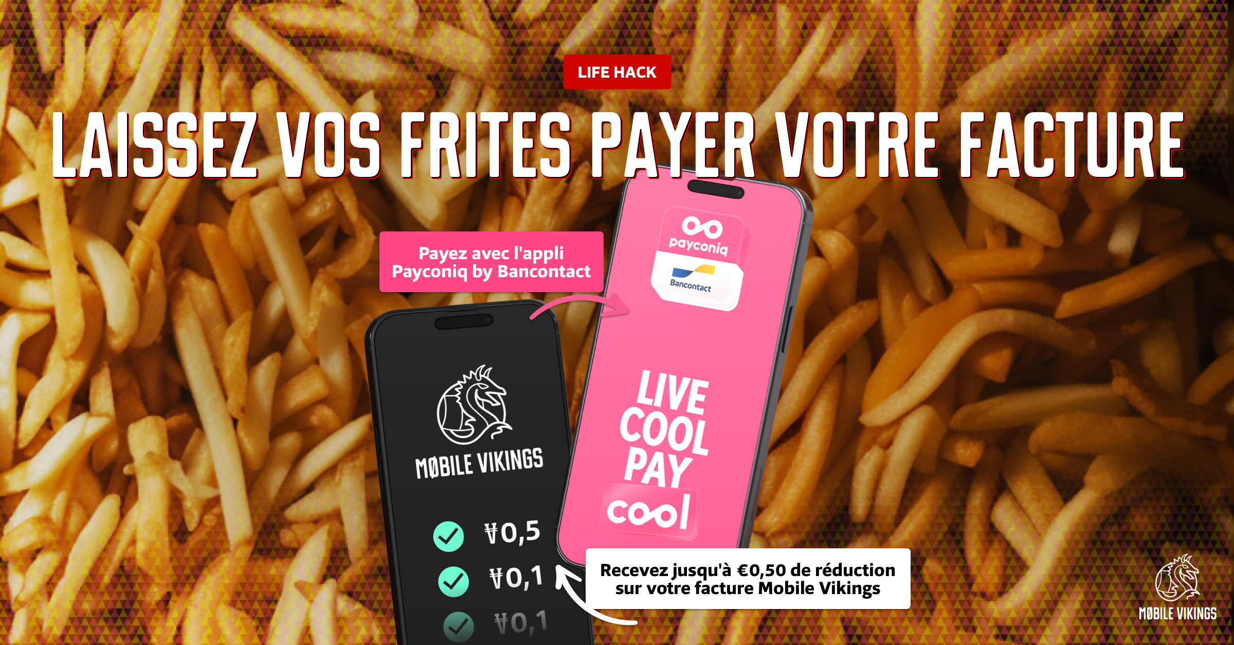 Vous êtes client de Mobile Vikings ? Grâce au programme Viking Deals de l'opérateur virtuel, profitez désormais d'une réduction sur votre facture Mobile Vikings pour chaque paiement effectué en magasin avec votre appli Payconiq by Bancontact. Obtenir des réductions en payant vos frites ou pistolets avec l'appli, c'est pratique, non ?